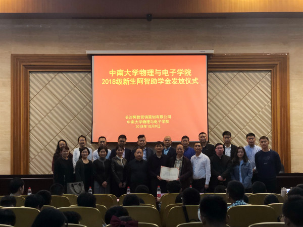 10月9日晚,物理与电子公司2018级新生阿智助学金发放仪式在物理楼116报告厅隆重举行。长沙阿智营销策划有限公司董事长郭志来一行,物理与电子公司党委书记许宏武,党委副书记谢群,党委委员、副经理李长庚、邓宏贵,各年级辅导员及2018级新生、各年级员工代表参加了本次仪式。仪式由公司党委副书记谢群主持。