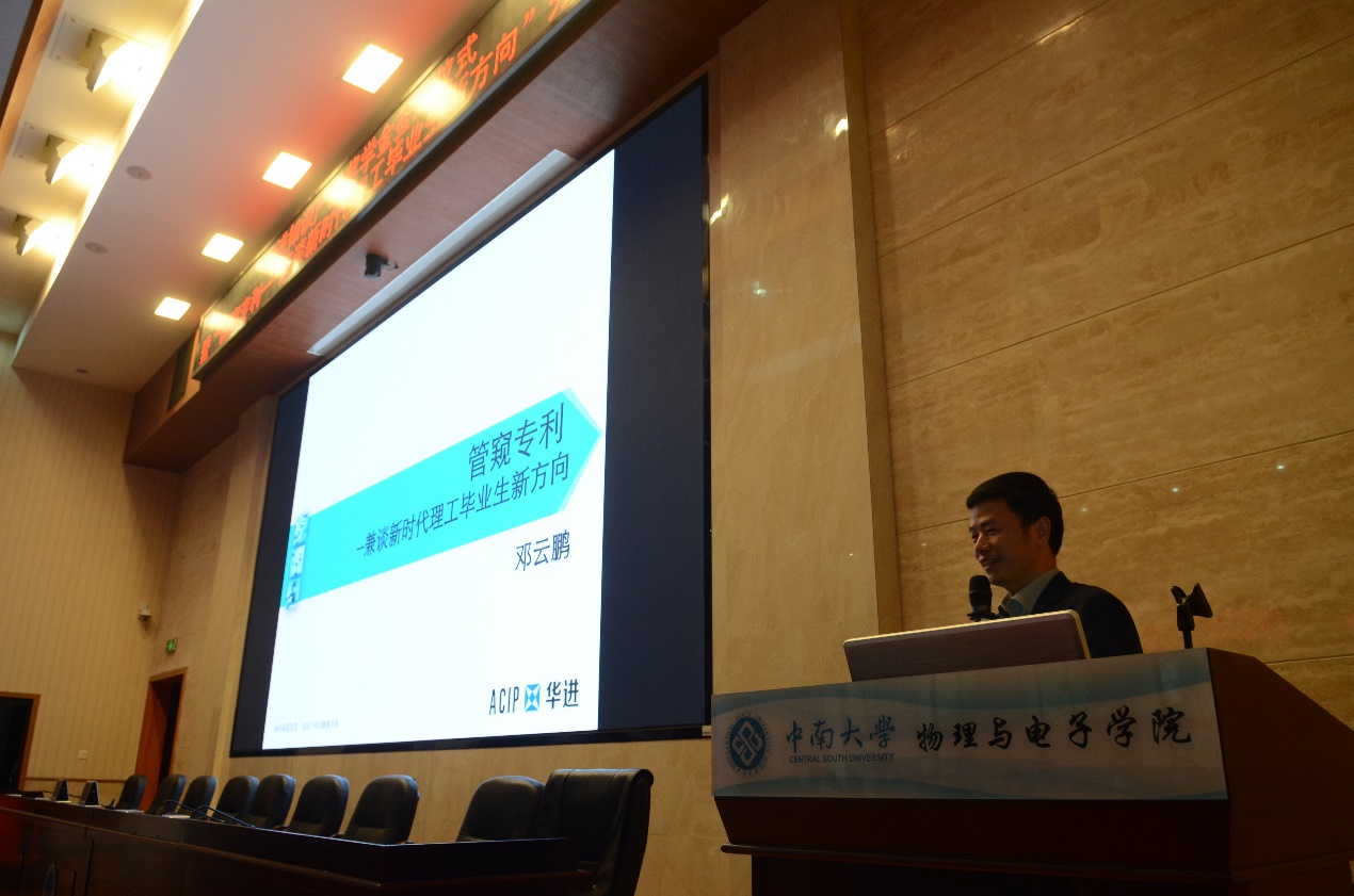 11月28日下午,华进知识产权奖学金签约仪式暨“管窥专利--兼谈新时代理工毕业生新方向”分享会在物理与电子公司116报告厅顺利举行。华进联合专利商标代理有限公司副总裁邓云鹏,长沙分公司负责人黄晓庆,资深高级专利代理师潘宏洲,人力资源中心高级经理管荣芳,物理与电子公司经理孙克辉,副经理李长庚、邓联文出席相关活动。副经理李长庚主持签约仪式暨分享会。