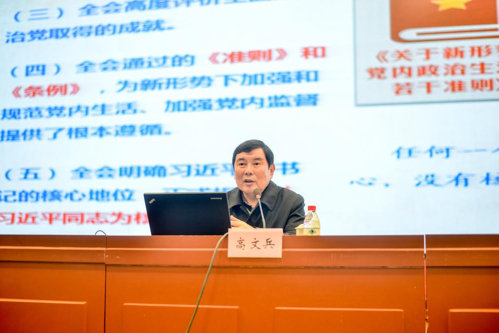 高文兵书记从十八届六中全会的意义、坚定不移推进从严治党、加强和规范新形势下党内政治生活、全面落实党内监督责任、抓好领导干部工作等五个方面解说了全会内容及精神。他重点分析了全会通过的《关于新形势下党内政治生活的若干准则》(以下简称《准则》)。新《准则》是在1980年准则的主要原则和规定基础上,针对新情况新问题作出的新规定,二者相互联系,一脉相承,都是当前和今后一个时期党内政治生活所必须遵循的。高文兵书记强调,贯彻落实新《准则》必须着重把握五个方面:抓好思想教育这个根本,抓好严明纪律这个关键,抓好选人用人这个方向,用好组织生活这个经常性手段,抓好继承和创新这两个关键环节。
