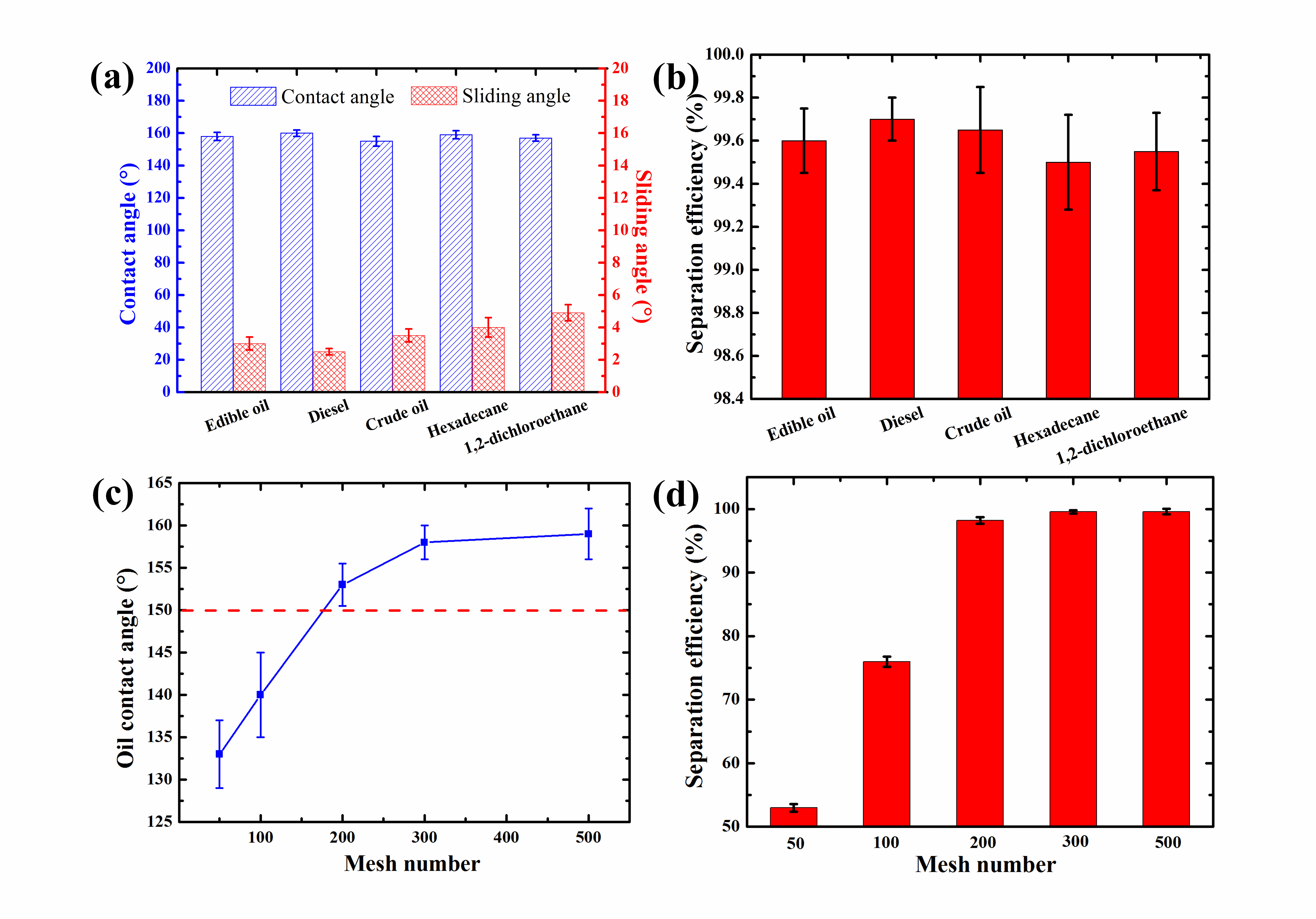 (a) 不同种类油滴的水下油接触角与滚动角;(b) 不同种类油滴的油水分离效率;(c) 不同目数不锈钢网的水下油接触角;