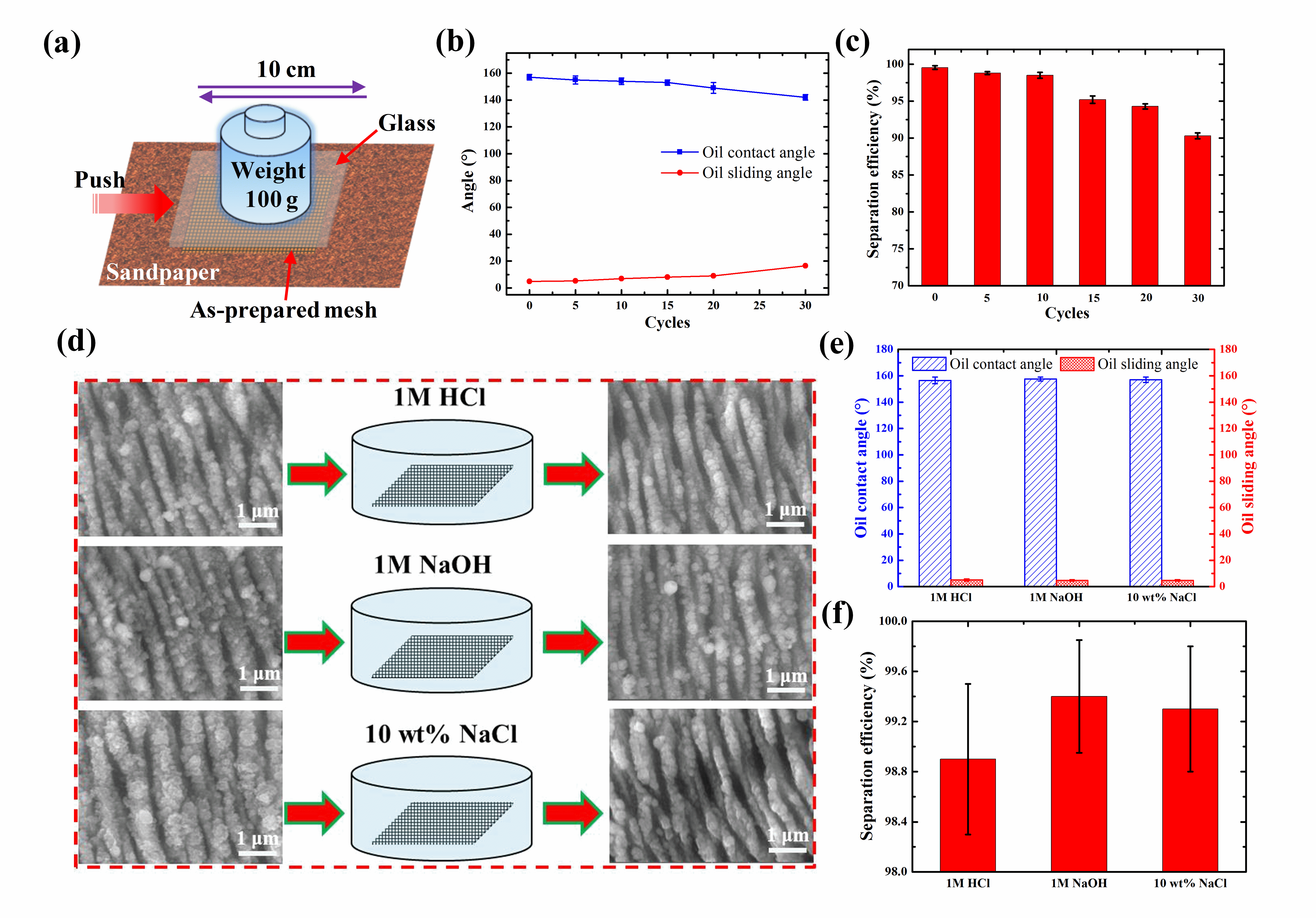 (a) 抗摩擦测试示意图;(b, c) 30次摩擦后,加工后不锈钢网表面的浸润特性与油水分离效率;(d) 抗腐蚀测试示意图及相应SEM图;(e, f) 在不同腐蚀环境下,加工后不锈钢网表面的浸润特性与油水分离效率。