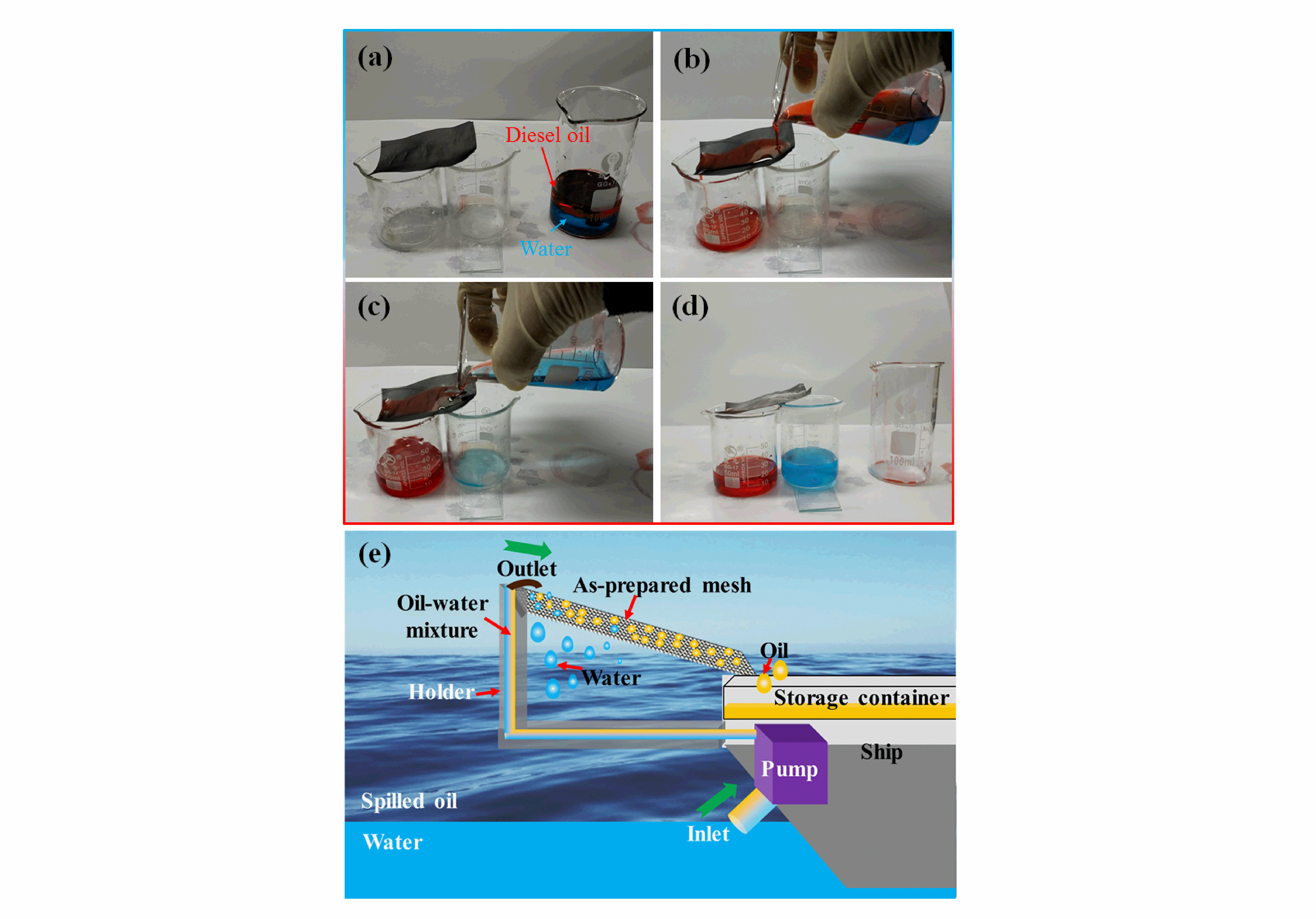 (a-d) 加工后不锈钢网的油水分离动态测试图片; (e) 应用于海洋大面积油水分离和油收集展望图。