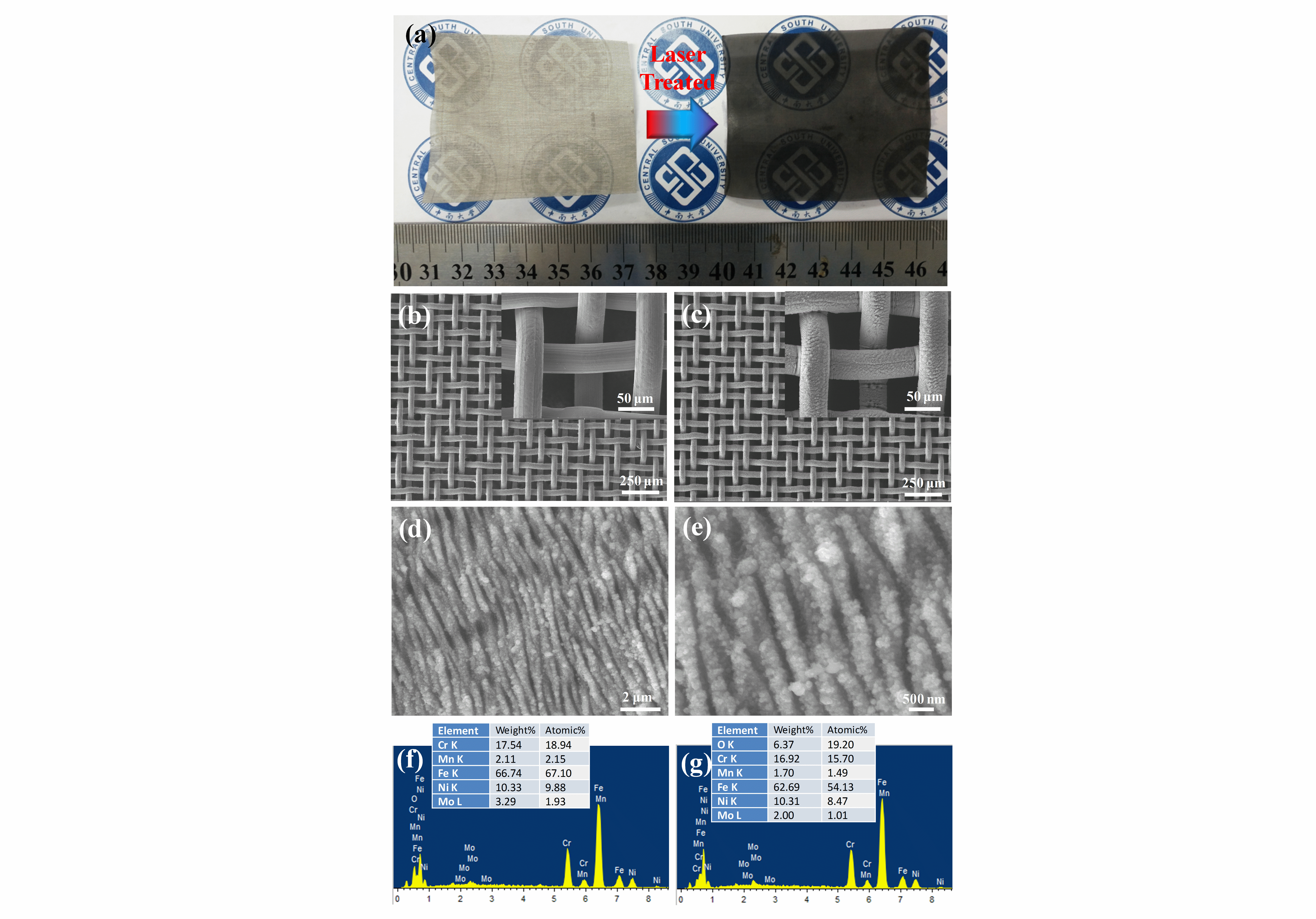图1:原不锈钢网与飞秒激光加工不锈钢网的表面形貌与能谱分析