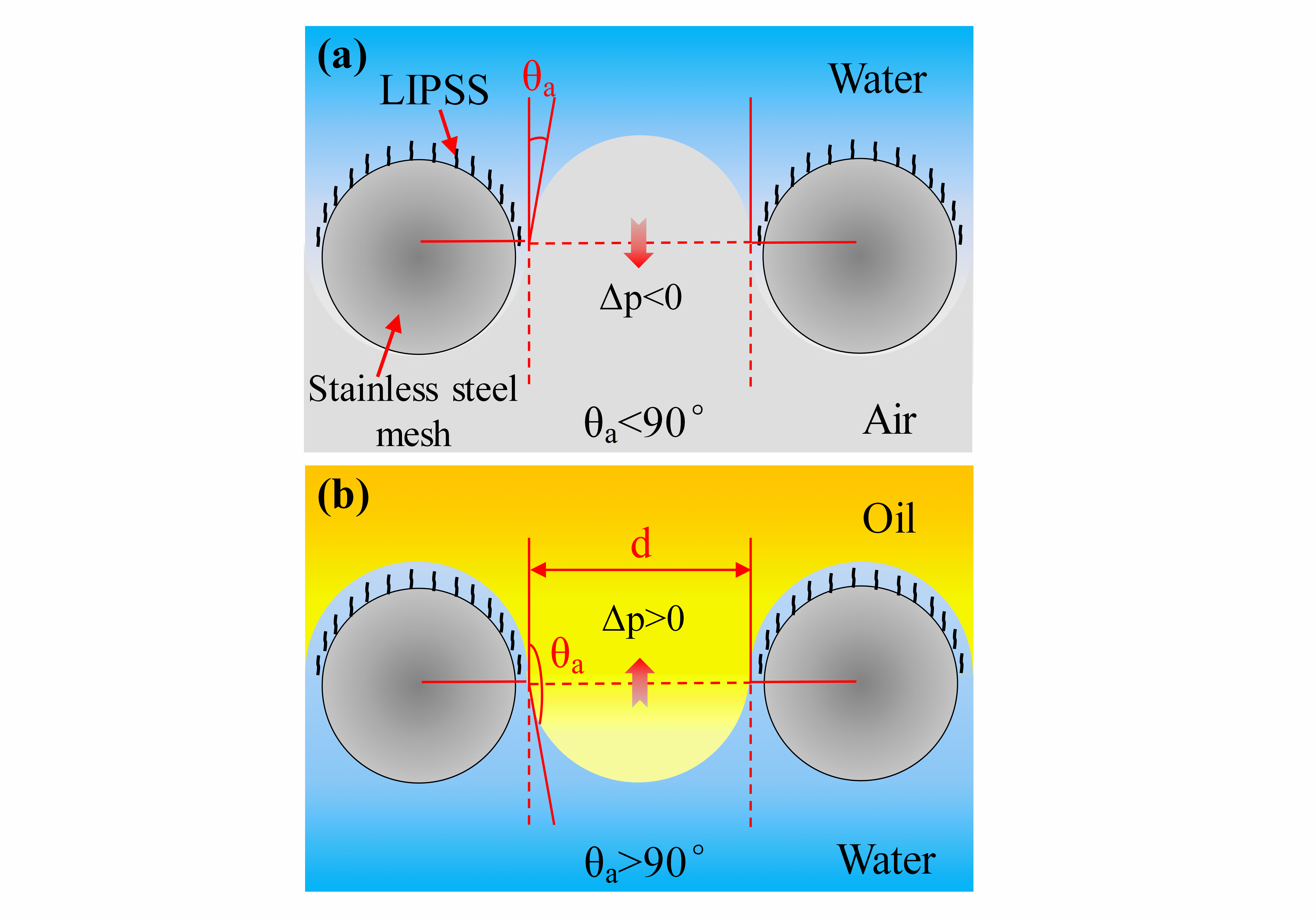 该研究提出了一种在不锈钢网表面采用飞秒激光直写扫描技术一步大面积加工纳米条纹结构的方法,所制备的不锈钢网具有空气中超亲水,水下超疏油的特性,并具有高达99%优异的油水分离效率。同时,其展现出较好的抗摩擦与抗腐蚀性能。该研究在海洋石油泄漏的清洁和原油收集中具有潜在的应用价值。