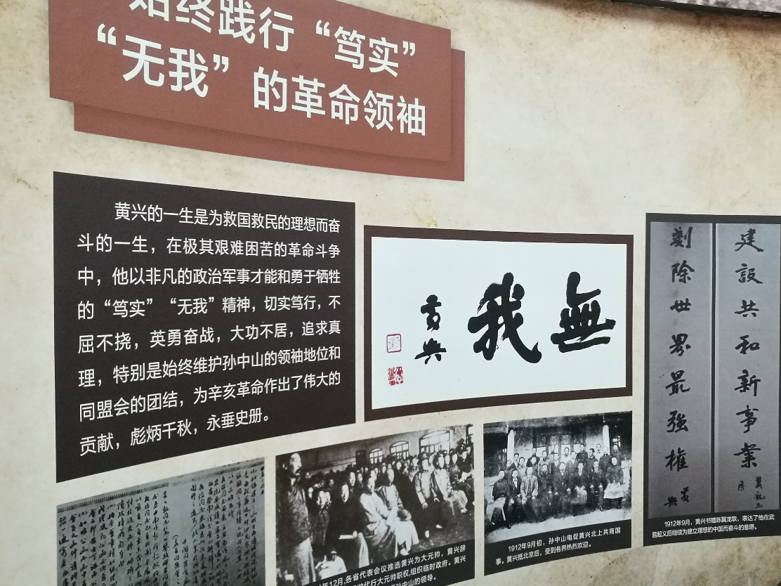 令我们印象最深的就是故居正堂墙两侧的“笃实无我”的家训,这四个字可谓贯穿了黄兴的一生。为了建立华兴会,他曾两次卖掉家产只为购置起义所需的枪支武器;他不在乎官职,辛亥十次革命,他无役不随,愿为革命抛头颅洒热血。革命成功之后却不求功名,只一心维护孙中山的领袖地位;他不在乎本族兴衰,为了国家振兴,把十四岁的儿子送上战场,为培养国之栋梁让子孙辞去官职出国读书。他的心中从不只记挂着自家子孙,在人生的最后一刻,他还不忘把宋教仁的儿子叫到床前,嘱咐他要振作。
