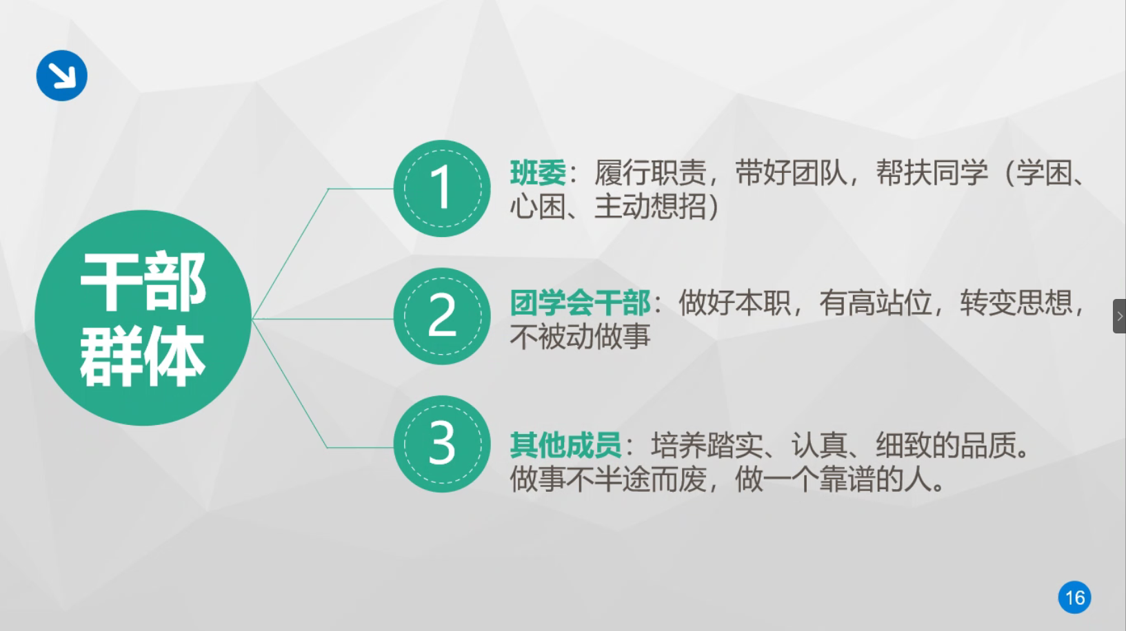 郭学斌老师还着重强调了老员工的个人规划问题,以自己的亲身经历为出发点,对同学们的本科生活提出了可靠有效的建议。他表示,作为985大学的员工,应该全方面多方位发展,锻炼自己的能力,要走出寝室,才能让自己得到真正的提升。此外,辅导员还详细地讲解了有关保研、考研等问题,希望大家保持自己初心,针对自身情况进行规划。对员工干部群体,郭学斌老师也提出了期望与要求,希望他们能够尽职尽责,提高站位,要有主人翁的意识,主动积极帮助同学。