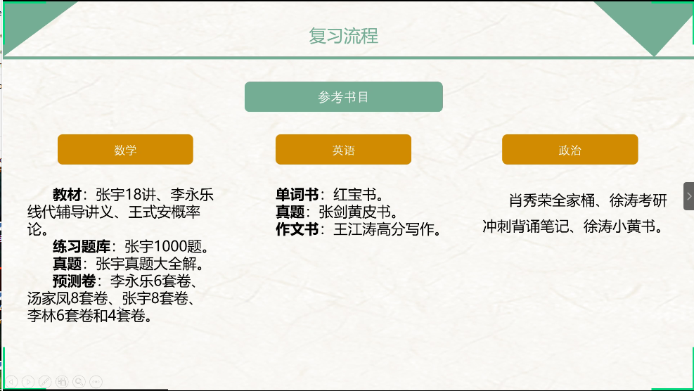 分享嘉宾依次讲述自己考研的历程,针对不同的科目给出了学习方法和复习经验,畅谈自己的感悟和体会。在数学考研复习上,五名同学一致认为应认真对待历年真题,以真题检验自己的功底,要进行归纳总结。黄志伟同学提出要注重数学的计算过程练习,而不是一味只掌握解题方法。专业课复习要重点关注目标院校的参考书目,知识点要理解透彻、认识到位。针对英语复习,王永松同学建议大家作文模板的运用要结合自己的积累,重在词汇量的积累。政治科目的复习,几位同学也推荐了自己认可的参考资料。