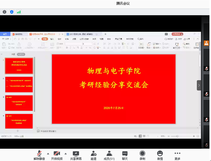 为增进物电院2017级员工对硕士研究生入学考试的了解,助力同学们取得理想成绩,考研成功上岸,7月25日晚,物电院考研经验分享交流会在腾讯会议线上平台成功举行。交流会由17级辅导员彭一鸣主持,五位2016级同学向100余名备考员工分享了他们的考研故事,并进行了答疑互动等。