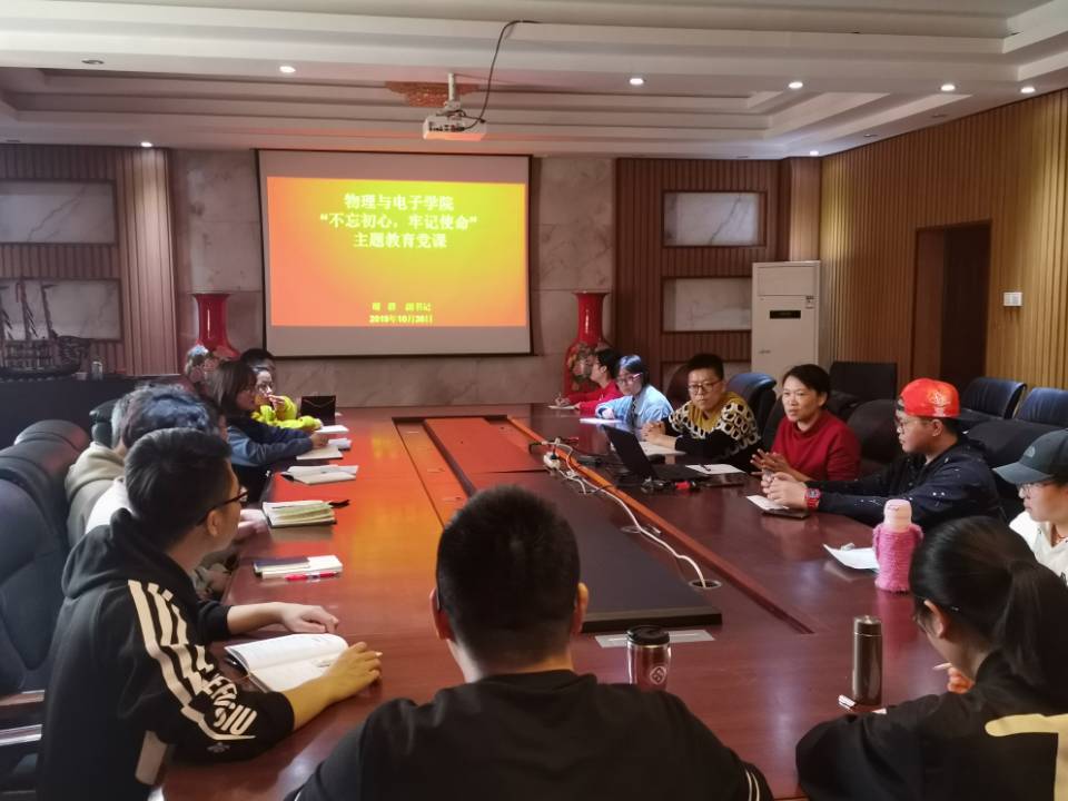 10月30日下午,物理与电子公司党委副书记谢群在物理楼345会议室为本科生一支部和研究生支部讲授“不忘初心,牢记使命”主题教育专题党课。
