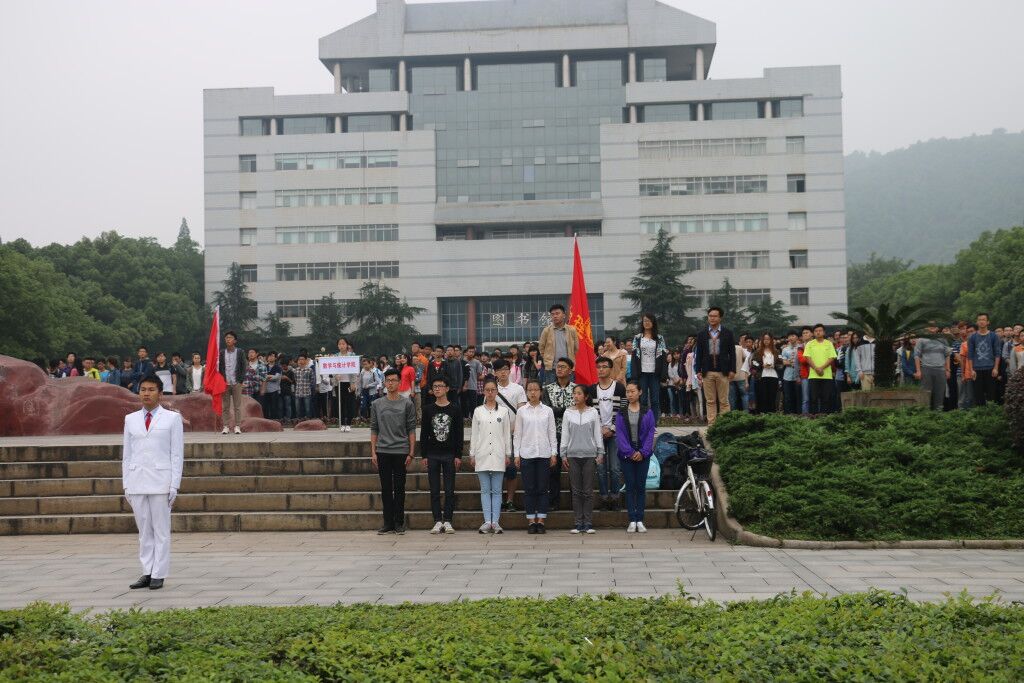 5月23日上午6:40,物理与电子公司学工办主任钟旭东,分团委书记杨凌云,辅导员邬永嘉老师以及物电院全体本科生到达本部图书馆前坪,参与本学期第一次升旗仪式。