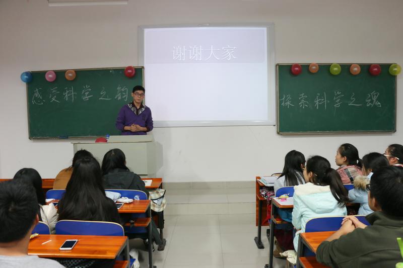 电科1404班团支书吕文豪结合富有特色的PPT,从科学的魅力、科技的发展、科学精神的培养等方面进行介绍,并组织了有趣的科技知识问答。“为什么大海是蓝色的?为什么破镜不能重圆”,同学们积极抢答科学小知识,现场气氛逐渐活跃起来。
