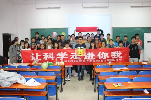 参观完实验室,两班在物理楼123教室开展了趣味科学实验系列活动。光电1502班姚鹏、电科1402班潘周同学先后为大家展示了“隔瓶吹蜡烛”、“烧不坏的手帕”、“纸片托水”和“针扎气球不破”四个趣味科学实验。随后,两班的团支书组织了“科学小知识抢答”竞赛,并以压破气球的方式抢答问题。问题内容涉及光学、天文学等领域,同学们积极思考踊跃答题,气氛热烈。活动结束,电科1402班易志为研墨提笔,为活动写下横幅并为获胜班级填写了奖状,两班同学互赠礼物并合影留念。