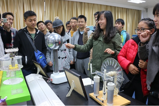 11月20日下午,物理与电子公司电科1402班、光电1502班在新校区以“让科学走进你我”为主题举行了班级联谊活动。活动开始,两个班级的同学们在肖思老师的带领下参观了A座四楼的三个物理实验室,近距离感受物理世界的奇妙。实验室分别展现了光学、电磁学、力学三个的物理领域的有趣现象,好奇的同学们或询问老师或亲手验证。光影室3D影像、光感应琴键以及力学实验室的风洞和转动平衡轮胎三个实验装置深受大家的喜爱。
