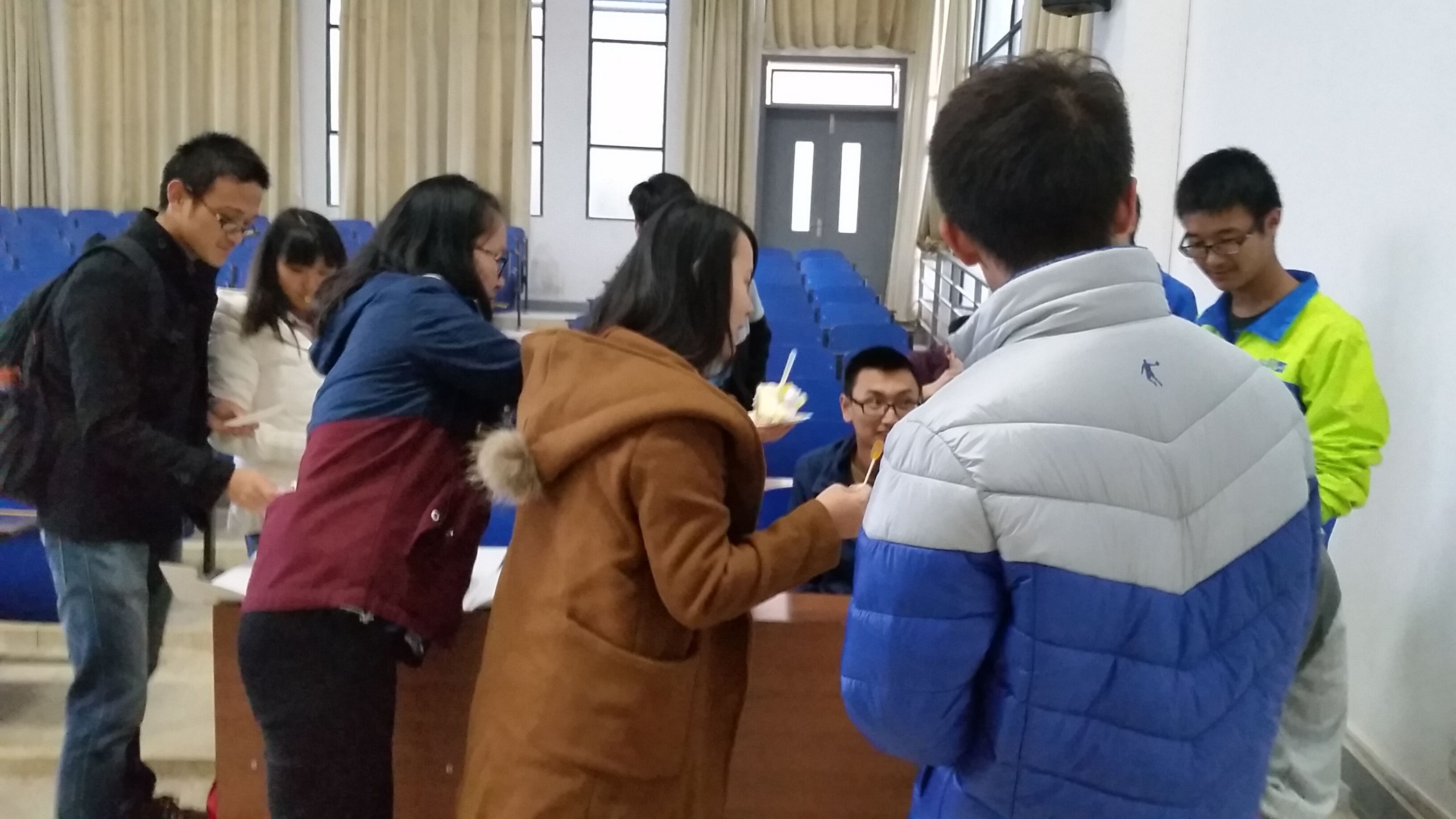 活动伊始,同学们欢聚一起,共同分享女生们精心准备的蛋糕,以及棒棒糖、饼干等特色小零食。吃饱之后,大家开始了好玩又刺激的团体游戏——脚踩气球,同学们两人一组,每人脚绑四个气球。气球被踩破则淘汰,最后脚上留有气球的小组,获得比赛的胜利。在游戏过程中,有的小队有所顾忌、积极寻找盟友,而实力较强者则肆无忌惮地寻找目标,半个小时的你追我赶后,场面持续升温,也迎来了活动的高潮。