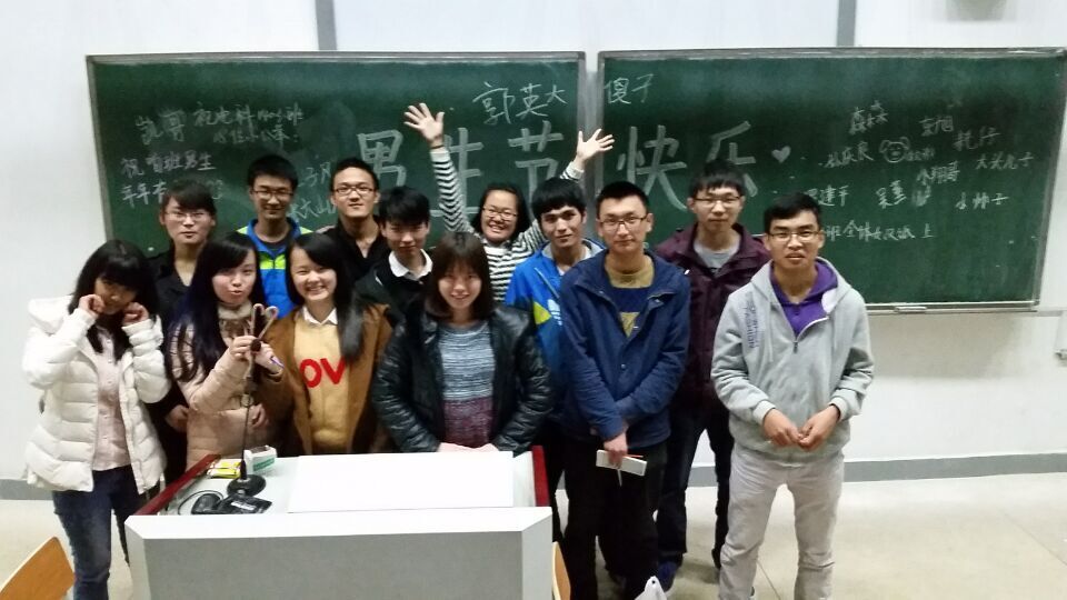 2015年11月11日下午,电科1403班的同学们在新校区D座116教室开展了男生节活动。本次活动由班里的9名女生精心准备,给予了男生们一次难忘的光棍节经历。下午13:00,女生们带好活动材料到达了新校区D座116教室,开始了紧张的布置工作。零食、气球、彩带的点缀也让教室多了几分温馨的节日气氛。下午14:00,男生们陆续到达了教室,见到教室里温馨的场面也颇受感动。