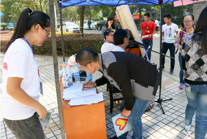 青志协成员通过发放宣传单、播放志愿者歌曲等多样宣传方式吸引了众多同学前来咨询。报名的同学们在志愿者展板上郑重地写下了自己的姓名,并按下手印表达他们成为志愿者的决心与热情。青志协还邀请了乐队现场演奏志愿者歌曲,悦耳的音乐与工作人员的热情解说也得到了同学们的一致好评,招募现场气氛十分热烈。