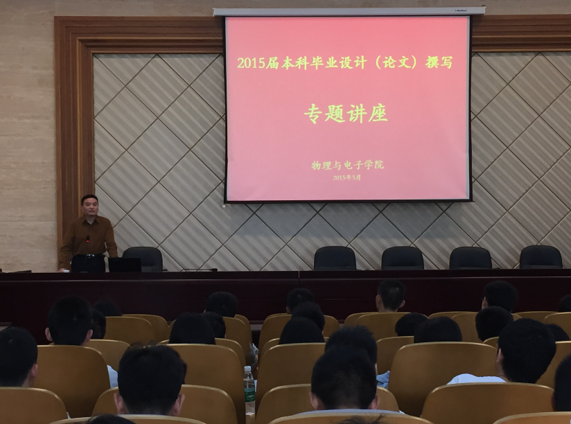 5月12日下午3点,物理与电子公司“2015届本科生毕业设计(论文)撰写专题讲座暨毕业生大会”在物理楼一楼报告厅成功举行。本次讲座由刘雄飞教授主讲。副经理孙克辉教授、公司教务办王旭红老师、辅导员陈芳老师及就业专干赖广文老师出席了大会。