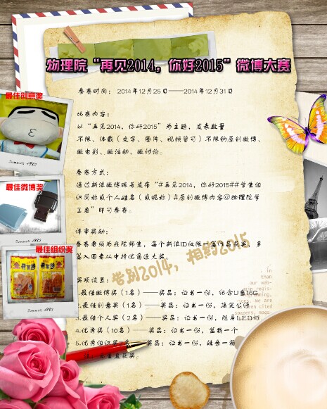 为了给大家提供一个总结过去,反思自我的平台,展现当代老员工风采,物理与电子公司于12月25日至12月31日开始举行以“再见2014,你好2015”为主题的微博原创大赛。